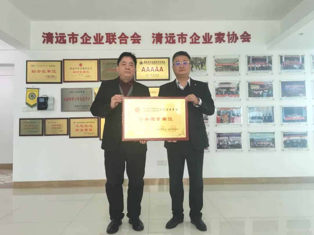 2025年4月1日,新入常务理事单位招商银行股份有限公司清远分行曲亮行长(右)一行到访协会,邱小艺执行会长(左)表示热烈欢迎,希望共同携手为会员单位提供金融服务支持,助力企业稳步发展,最后并颁发了会员牌匾。